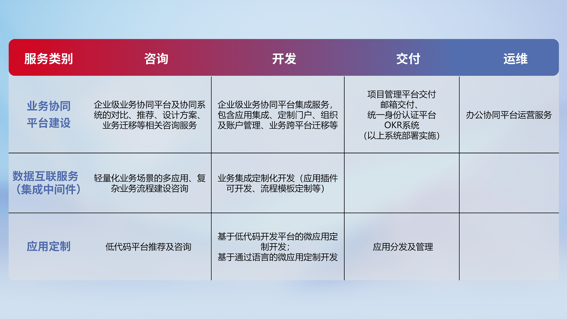 针对钉钉、、企微、、、、IDaas等平台级产品提供产品的规划、、方案、、交付、、、、定制化开发等服务,,,实现如统一协同办公、、智能客户服务、、混合会议管理、、智能数据查询、、等业务场景,,实现数字化转型。。。